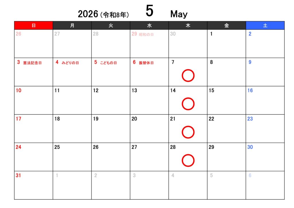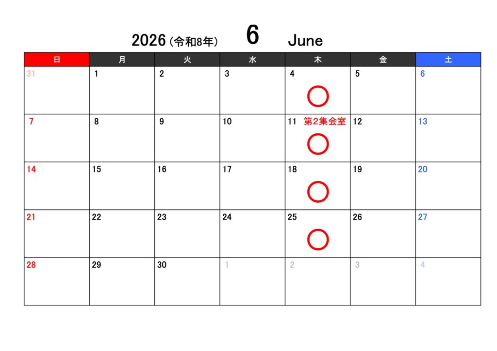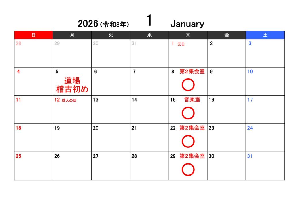 ○印が稽古有り、×が稽古無しとなります。