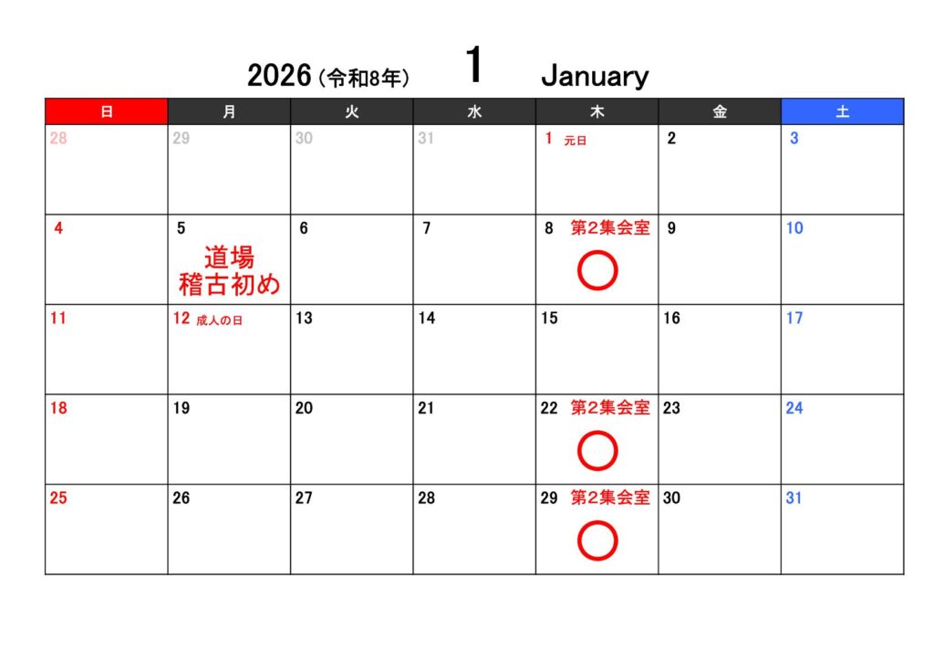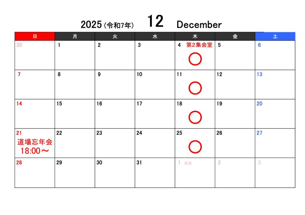 ○印が稽古有り、×が稽古無しとなります。