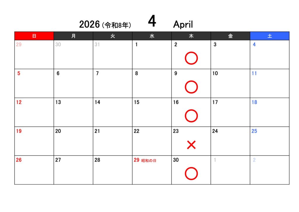 ○印が稽古有り、×が稽古無しとなります。